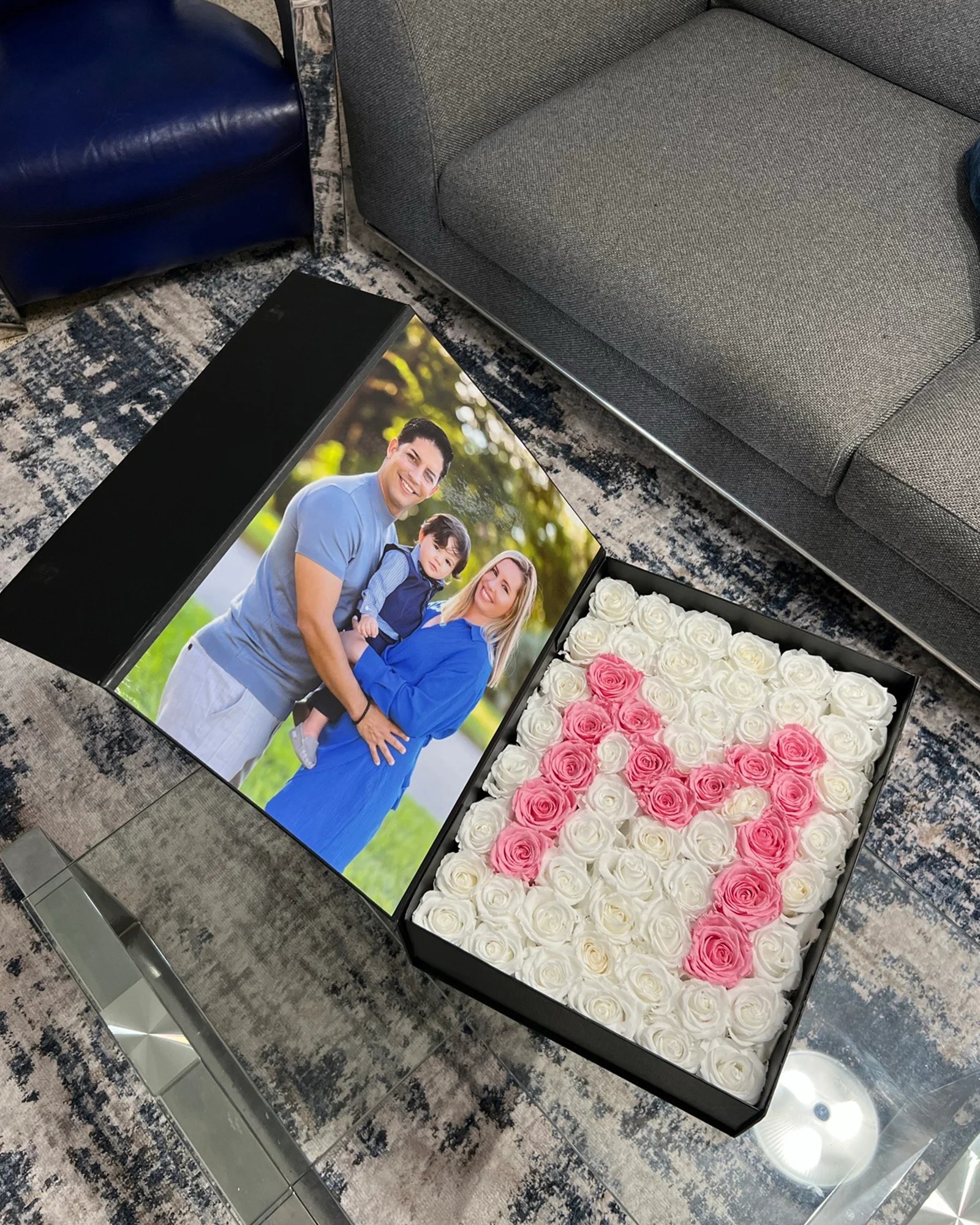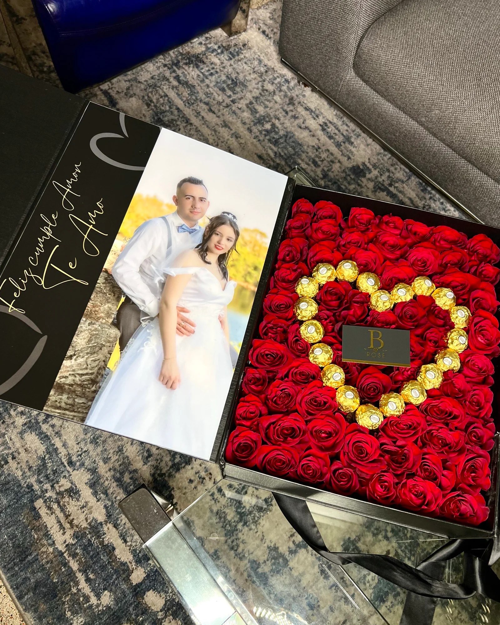 Hermosa caja con impresión de alta definición en material de acrílico, acompañada de flores de tu elección y mensaje personalizado. ¡Un recuerdo que perdura en el tiempo!