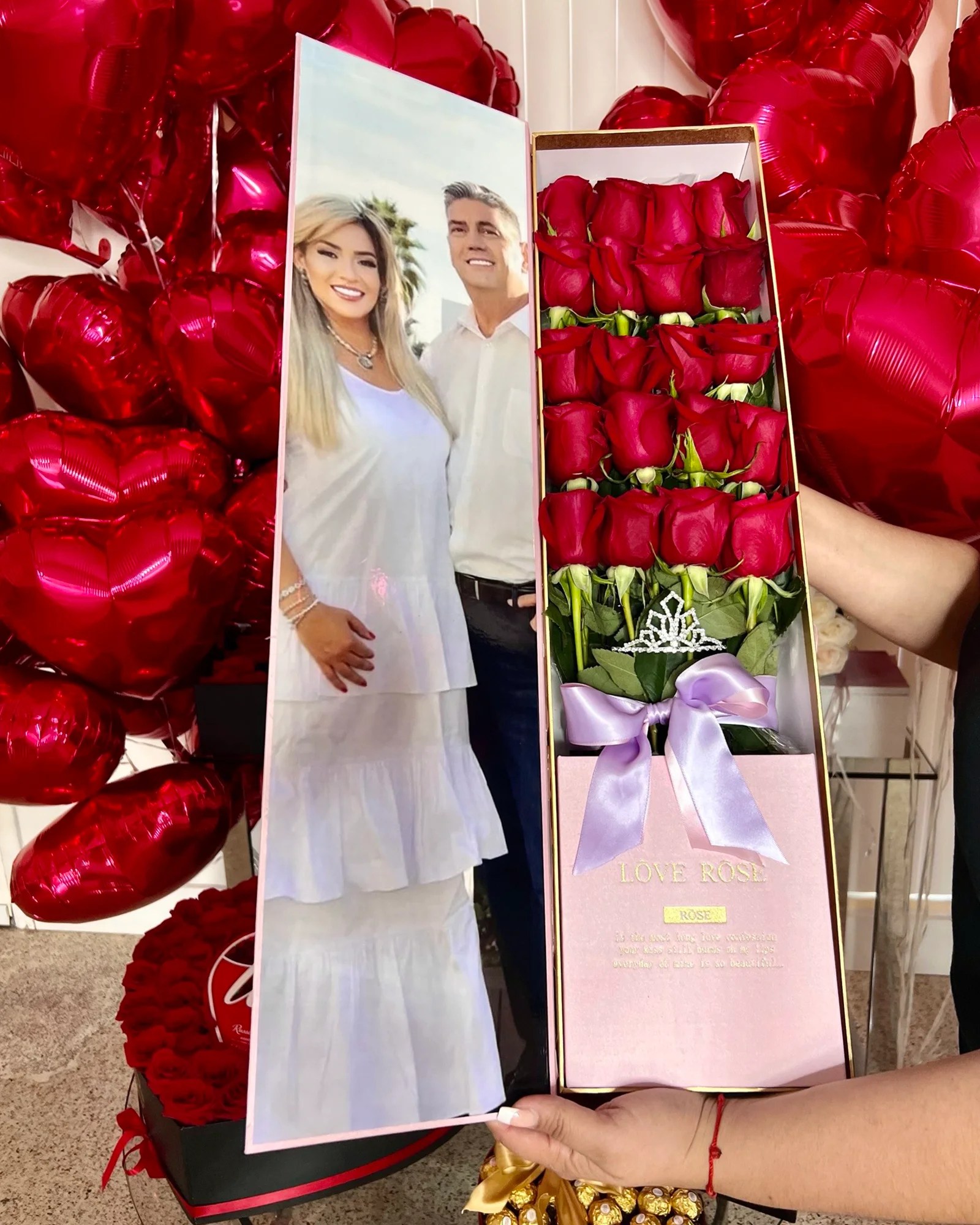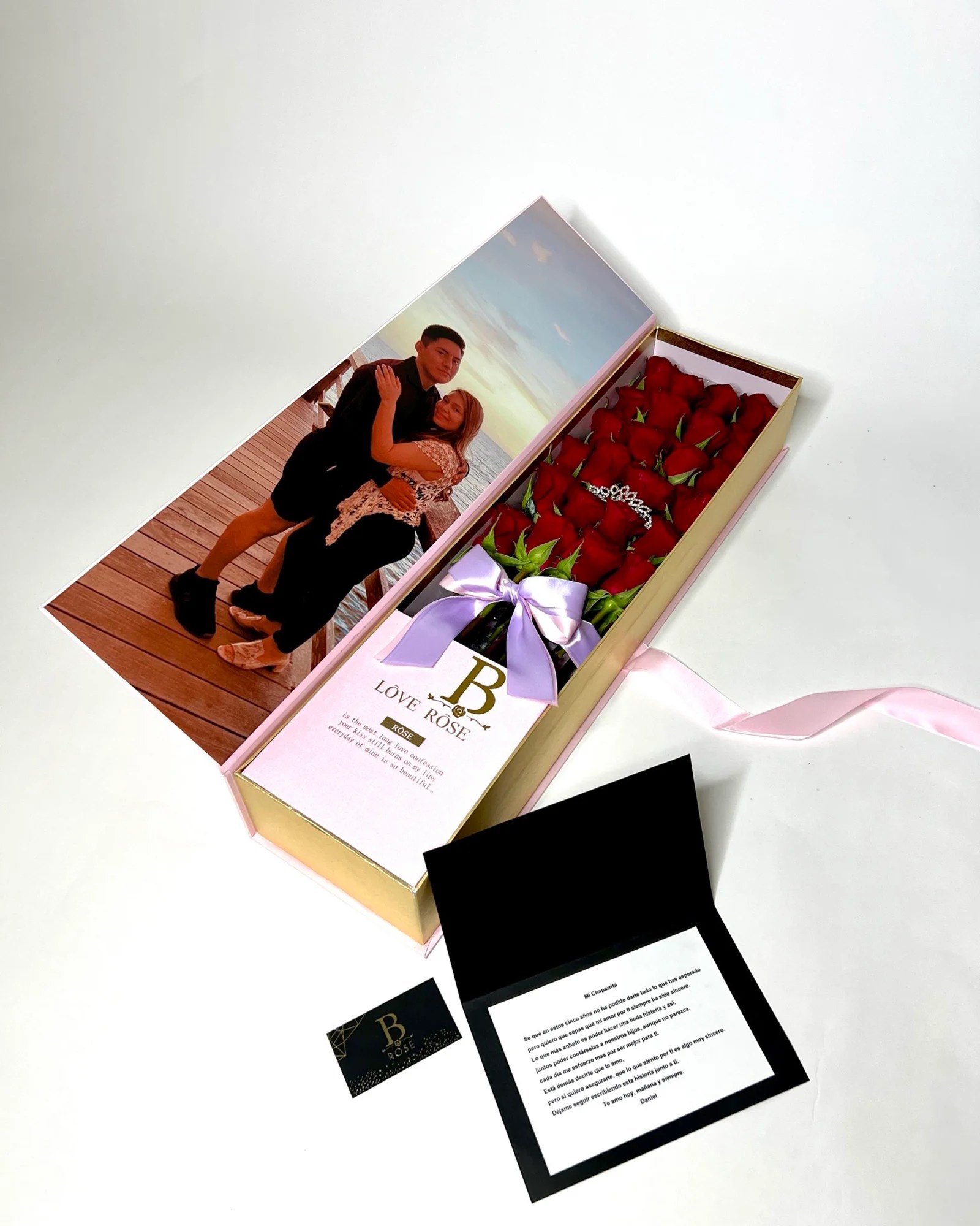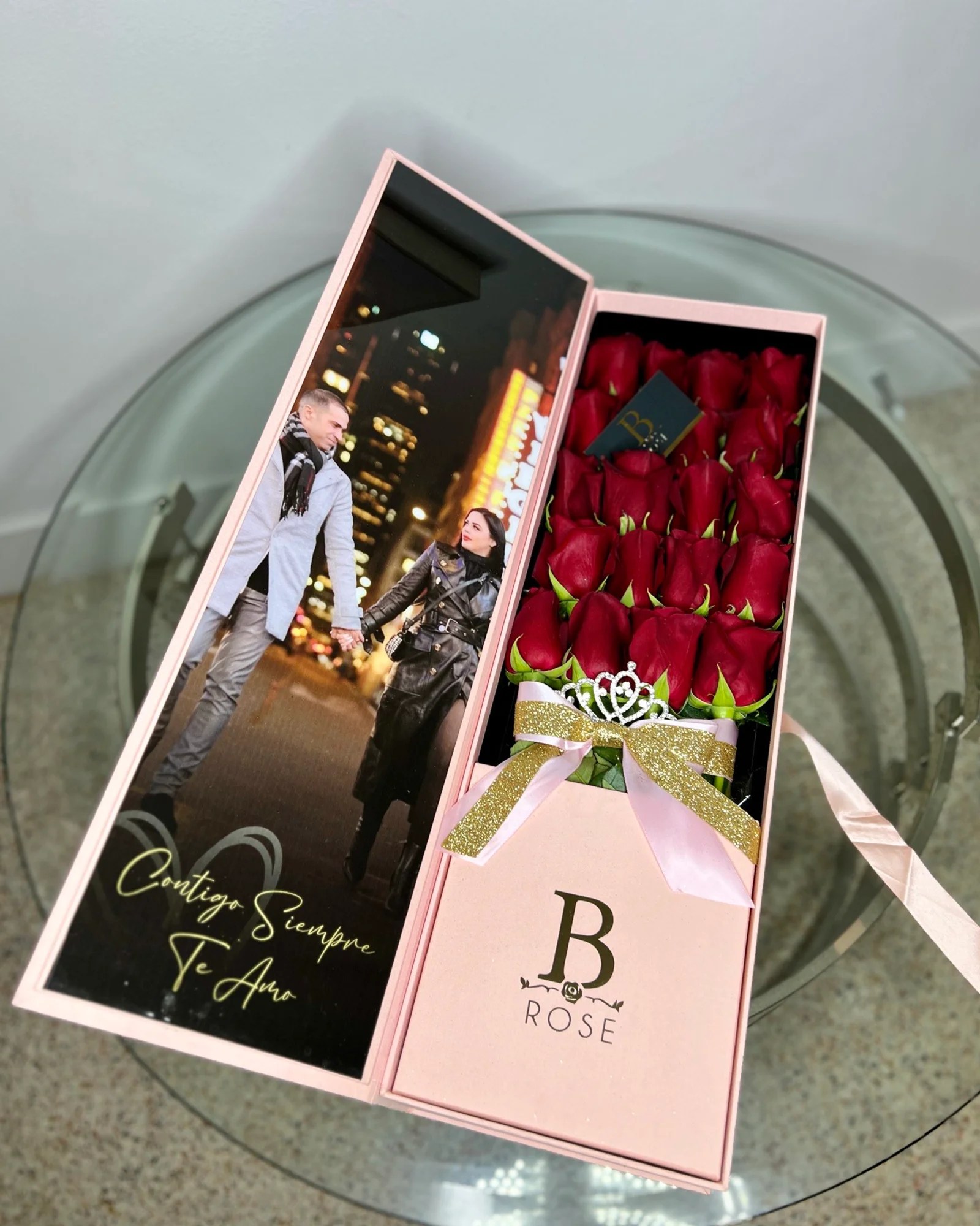 Hermosa caja de lujo satinada con impresión de alta definición en material de acrílico, acompañada de flores de tu elección y mensaje personalizado. ¡Un recuerdo que perdura en el tiempo!