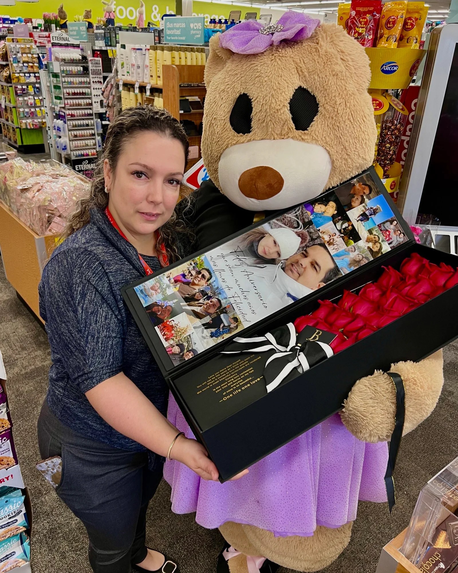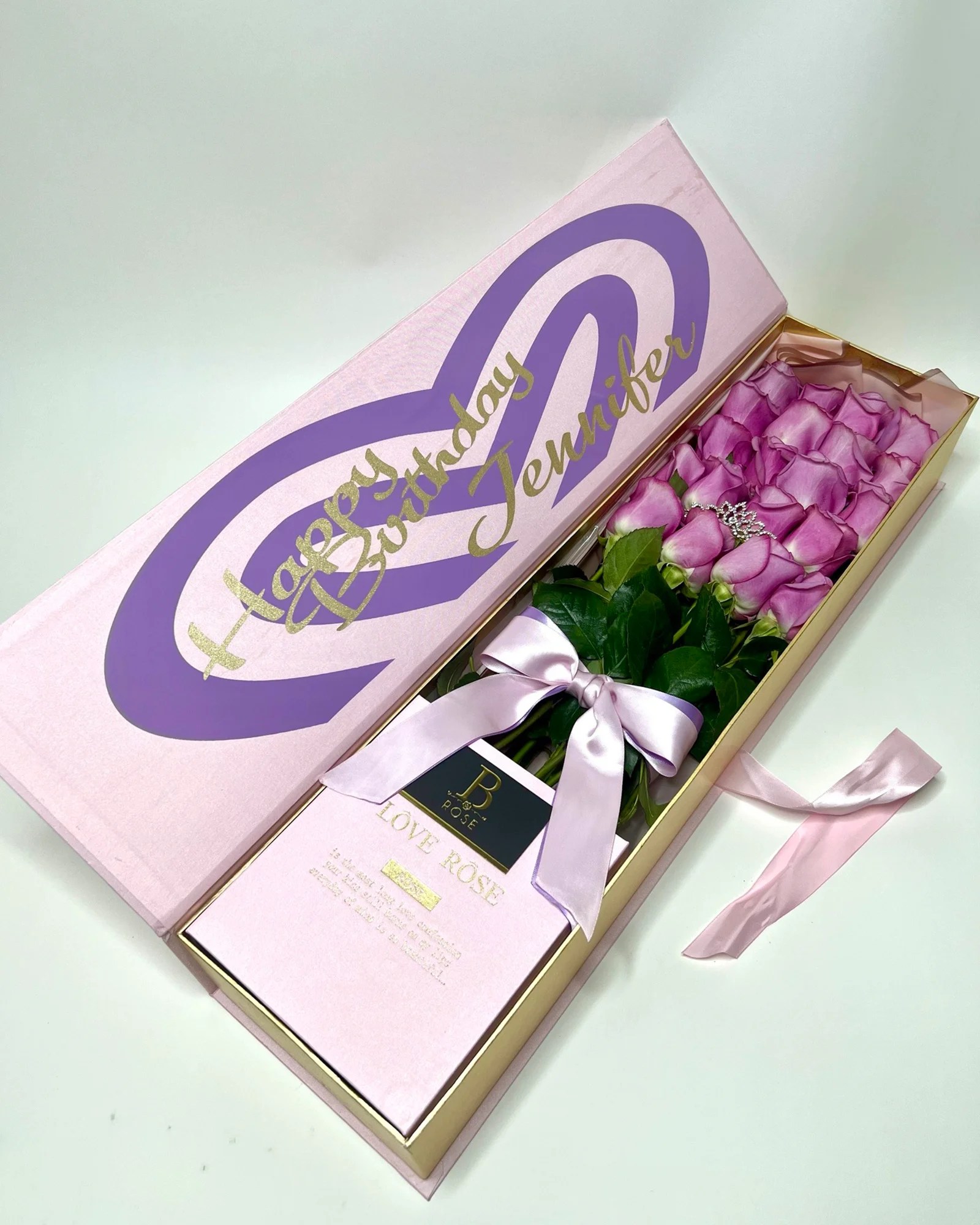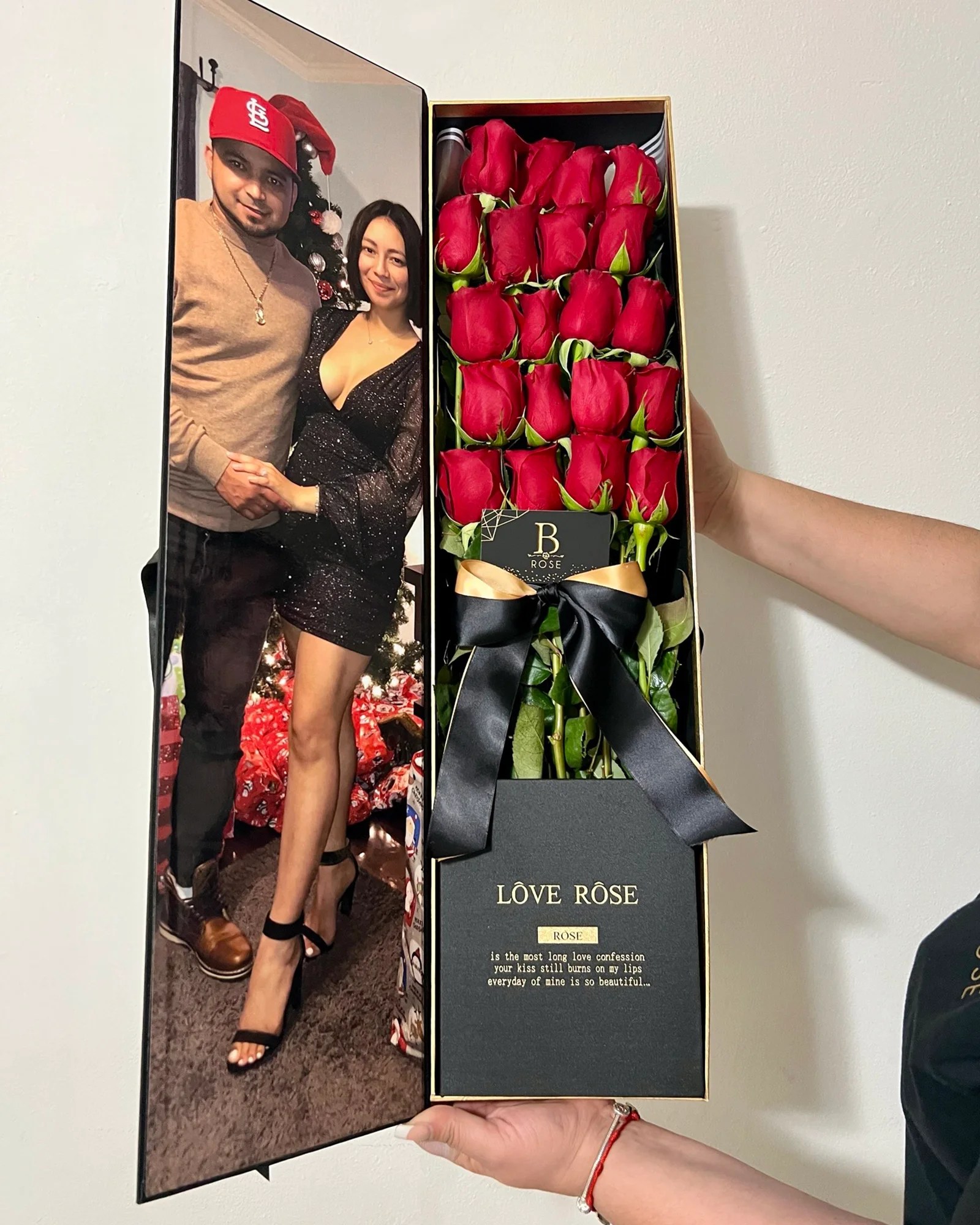 Hermosa caja de lujo satinada con impresión de alta definición en material de acrílico, acompañada de flores de tu elección y mensaje personalizado. ¡Un recuerdo que perdura en el tiempo!